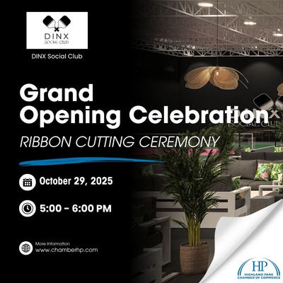 The Highland Park Chamber of Commerce invites you to a ribbon cutting celebration for DINX Social Club on Wednesday, October 29 at 5:00 PM.