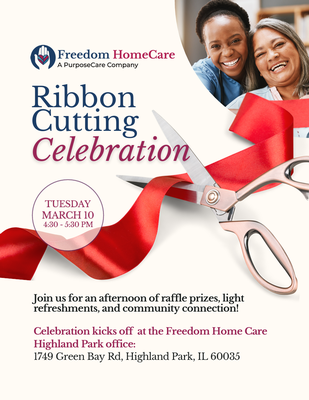 A ribbon cutting ceremony will take place at 4:30 pm on Tuesday, March 10th to celebrate Freedom Home Care's rebranding to Freedom Home Care - A PurposeCare Company. The ribbon cutting ceremony will take place shortly after 4:30 pm, so please plan to arrive on-time or earlier to show your support!